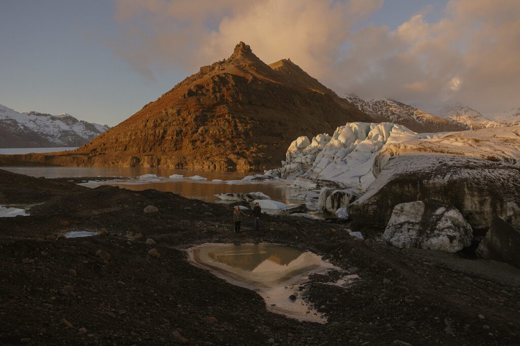 Vatnajökull Glacier National Park is home to, well, Vatnajökull Glacier itself—which just so happens to be the largest glacier in Europe! It covers a whopping 80% of Iceland’s land mass (insane) and boasts absolutely insane landscapes of ice caps, mountains, and outlet glaciers. This park is a phenomenal elopement location for any couple, but especially for those who love the idea of going on a once-in-a-lifetime adventure during their trip; the park is known for its epic boat tours through the Jokulsarlon glacier lagoon, ice caving tours, and glacier hiking from Skaftafell. No matter if you explore these rugged ice-covered landscapes by foot or boat, you’ll be in for the most magical experience of your life.